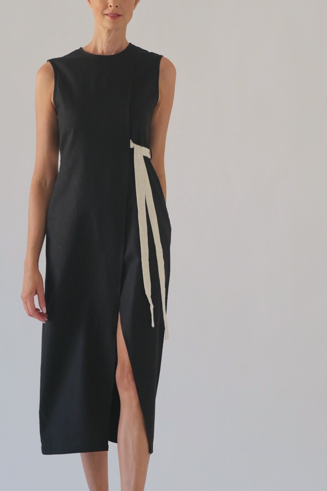 Playing on classic designs, the Aurore Midi Dress in Black makes a unique statement. Its high neckline, dramatic front split, and waist ties are crafted to flatter the body. Made from a luxurious fabrication, this dress is a perfect addition to your fall wardrobe. Simply switch up the styling to wear it for the office or for fun after work.