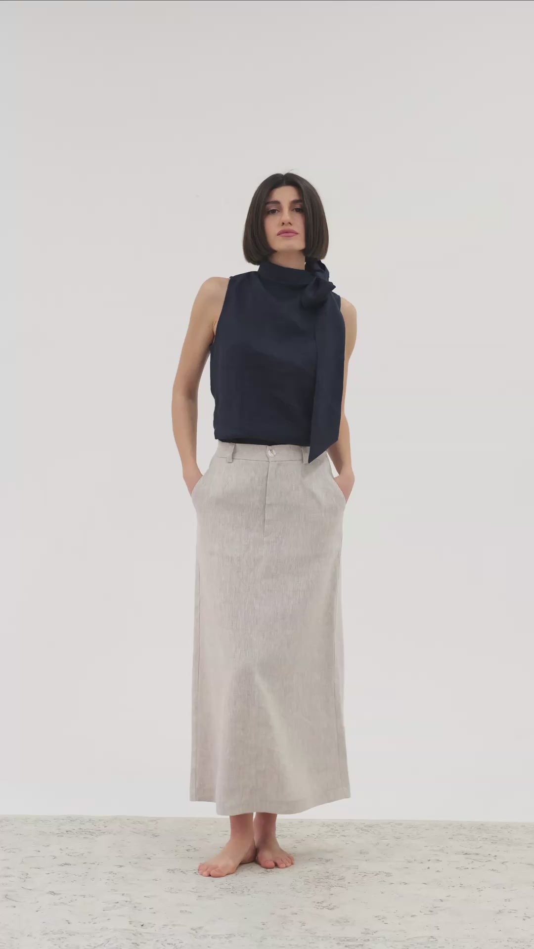 Crafted from pristine white linen, this sleeveless top exudes a casual yet elegant silhouette, boasting a tie detail that can be fashioned into a delicate bow.  As a variation of our self-tie series, the Axel presents an understated yet uniquely stylish and elegant addition to your wardrobe.